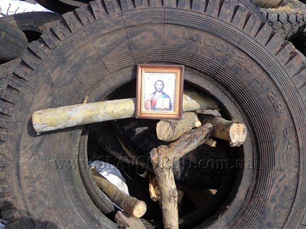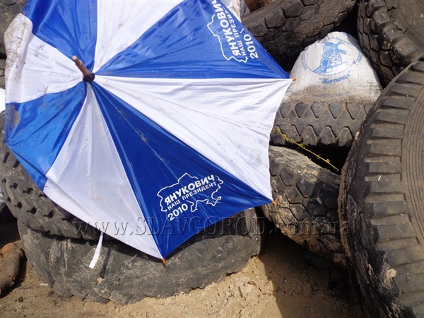 Separatistii au instalat,pe baricadele din jurul Comisariatului de Politie din Slaviansk, o umbrela cu inscriptia ”Ianukovici este presedintele nostru”.