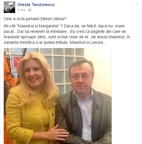 Ati citit „Maestrul si Margareta” ? Daca da, va felicit, daca nu, mare pacat…Dar sa revenim la intrebare…Eu cred ca paginile din care se hraneste aproape zilnic, sunt scrise chiar de el…de insusi Maestrul. In varianta mioritica s-ar putea intitula: Maestrul si Lenuta…”, a scris Oreste pe Facebook.