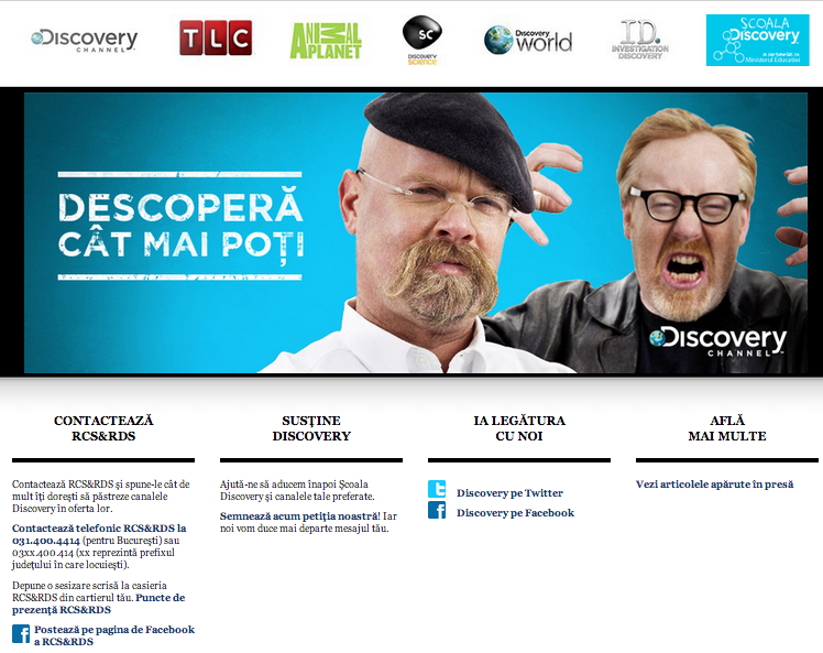 „Ne pare rău să vă anunțăm că acordul de retransmisie între Discovery Networks și RCS&RDS urmează să expire pe 30 noiembrie. În pofida eforturilor noastre de a ajunge la un nou acord cu RCS&RDS, pe parcursul unei perioade de negocieri de luni de zile, aceștia au respins toate ofertele noastre. Operatorul a făcut deja schimbări în grila sa de programe, eliminând Discovery World, TLC și Animal Planet din unele pachete”, se precizează pe site-ul prietenii.discovery.ro.