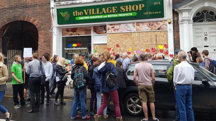 În ciuda vremii ploioase, oamenii n-au stat pe gânduri şi au umplut una dintre ferestrele magazinului cu mesaje de susţinere emoţionante, adresate atât românului care deţinea magazinul The Village Shop, cât şi întregii comunităţi de imigranţi din oraşul Norwich, potrivit Norwich Evening News. Toate mesajele au fost scrise pe bucăţi de hârtie roşie, în formă de inimă, scrie gandul.info.