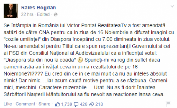 „Se întâmpla in România lui Victor Ponta! RealitateaTv a fost amendată astăzi de către CNA pentru ca in ziua de 16 Noiembrie a difuzat imagini cu „cozile umilinței” din Diaspora începând cu 7.00 dimineata in ziua votului. Ne-au amendat si pentru Titlul care spun reprezentanții Guvernului si cei ai PSD din Consiliul Național al Audiovizualului ca a influențat votul: „Diaspora sta din nou la coada” Spuneți-mi va rog din suflet daca oamenii astia au învățat ceva in urma rezultatului de pe 16 Noiembrie?!???? Eu cred din ce in ce mai mult ca nu au inteles absolut nimic! Dar nimic. …iar acum caută motive pentru a se răzbuna. Oameni mici, meschini. Caractere mizerabile…. Urat. Nu as fi dorit înaintea Sărbătorii Nașterii Mântuitorului sa fiu nevoit sa reactionez lansa ceva”, a scris Rares Bogdan pe pagina sa de Facebook.