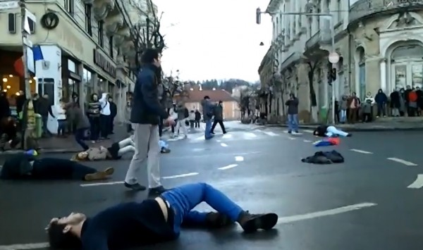 Dramatică punere în scenă a tragicelor evenimente din 21 decembrie 1989 din piața Libertății, unde au fost omorâți mai mulți clujeni. După fix 25 de ani un artist pune în scenă “momentul zero” al Revoluției de la Cluj.