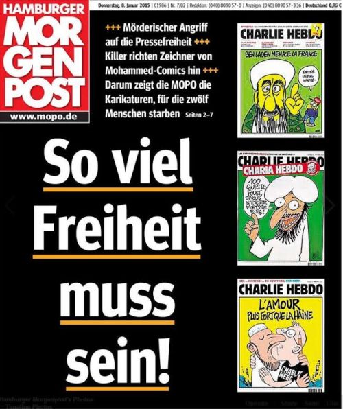Cotidianul regional german “Hamburger Morgenpost” a publicat pe pagina întâi, în dimineaţa de după atacul terorist de la Paris soldat cu 12 morţi, trei caricaturi reproduse din “Charlie Hebdo”. Titlul mare ales de conducătorii tabloidului hamburghez pentru ediţia din 8 ianuarie a fost “Atâta libertate trebuie să fie posibilă!”. Riposta a sosit în noaptea de sâmbătă spre duminică, o oră şi douăzeci de minute după miezul nopţii, când sediul redacţiei a fost ţinta unui atac cu pietre şi un dispozitiv incendiar, aruncate printr-o fereastră.