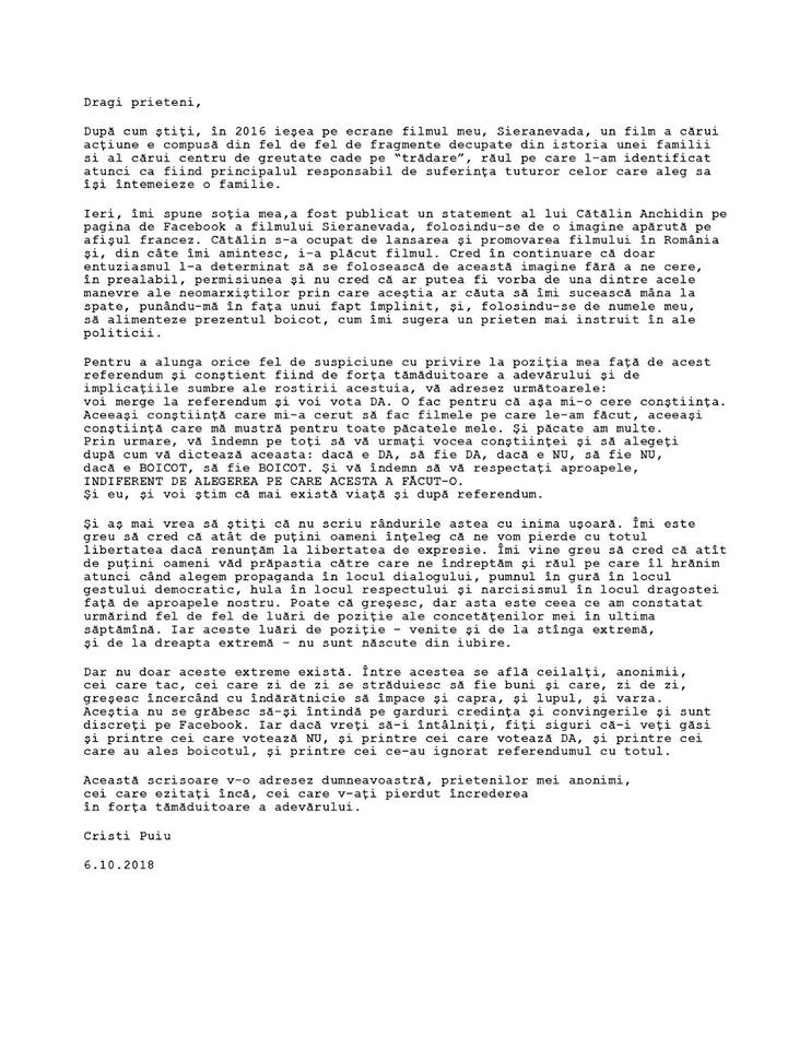 „Pentru a alunga orice fel de suspiciune cu privire la poziția mea față de acest referendum și conștient fiind de forța tămăduitoare a adevărului și de implicațiile sumbre ale rostirii acestuia, vă adresez următoarele: voi merge la referendum și voi vota DA. O fac pentru că așa mi-o cere conștiința. Aceeași conștiință care mi-a cerut să fac filmele pe care le-am făcut, aceeași conștiință care mă mustră pentru toate păcatele mele. Și păcate am multe. Prin urmare, vă îndemn pe toți să vă urmați vocea conștiinței și să alegeți după cum vă dictează aceasta”, spune regizorul.