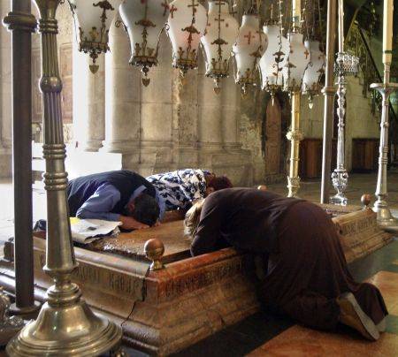 Mormantul Sfant este asaltat. Oamenii asteapta smeriti sa intre si sa-l viziteze. Nu au voie sa faca fotografii sau sa filmeze. Totul se petrece in clarobscur, ca intr-o pictura a lui Caravaggio. La iesirea din Mormant, te intampina o lespede la nivelul solului. Este lunga si lata cat un catafalc, are o culoare rosiatica in lumina crepusculara, iar oamenii se inghesuie sa o atinga. Mi se spune ca este piatra pe care Iisus a fost uns cu mir dupa ce a fost coborat de pe Cruce. Este ciudat ca din piatra, dupa atatia ani, mai izvoraste mir. Lespedea pare inundata de ceara, in schimb cand o atingi e parfumata si uleioasa, calda, cum se spune in popor – tocmai buna sa o pui pe rana. Am facut si eu mimetic ceea ce faceau ceilalti. M-am rugat si in timpul rugaciunii am uns cu mir cruciulitele din lemn de maslin cumparate mai devreme din bazar.
