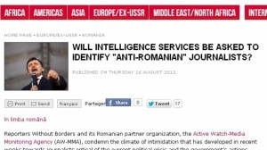 Organizaţia Reporteri fără Frontiere condamnă climatul de intimidare creat în ultimele săptămâni împotriva jurnaliștilor care s-au exprimat critic față de actuala criză politică și față de acțiunile guvernului, potrivit unui comunicat de presă al organizaţiei. Organizația se declară îngrijorată de anunţul făcut de preşedintele interimar Crin Antonescu în data de 8 august, când acesta și-a exprimat intenția de a cere Serviciului de Informații Externe să ancheteze “mecanismul prin care imaginea unei ţări a fost distrusă în două săptămâni într-o acţiune evident organizată, coordonată, finanţată. Trebuie să vedem totuşi cine a făcut asta, pentru că este ceva ce afectează ţara, toată ţara.”