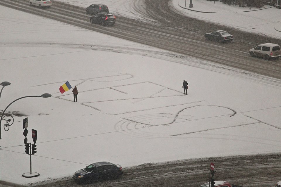 Primul protestatar care a ajuns miercuri dimineata, pe viscol, in Piata Victoriei, unde au loc in fiecare seara manifestatiile de sustinere a justitiei si impotriva Guvernului, a scris REZIST in zapada adunata pe asfalt. Potrivit unui cititor Hotnews, o tanara care se afla miercuri dimineata in Piata Victoriei merge permanent pe conturul literelor, pentru ca acestea sa nu fie acoperite de zapada.