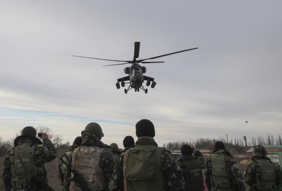 Russian army MI-35 military helicopter patrols the area as Ukrainian servicemen guard a checkpoint near the village of StrelkovoRăzboiul Rece a început din nou.
