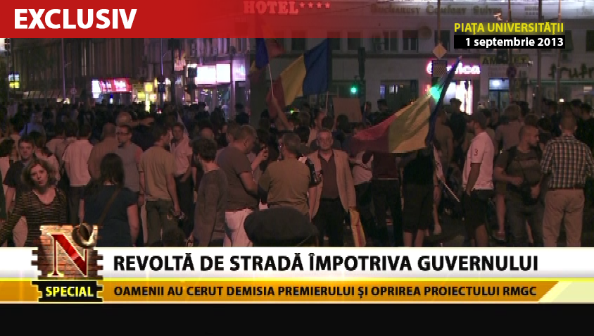 Piața Universității din Capitală a fost, în această seară, scena unor proteste fără precedent de la manifestațiile de stradă din primăvara anului 1990. Peste 5.000 de oameni fără culoare politică, în majoritate tineri, au cerut în cor demisia premierului Victor Ponta și oprirea controversatului proiect minier de la Roșia Montană.