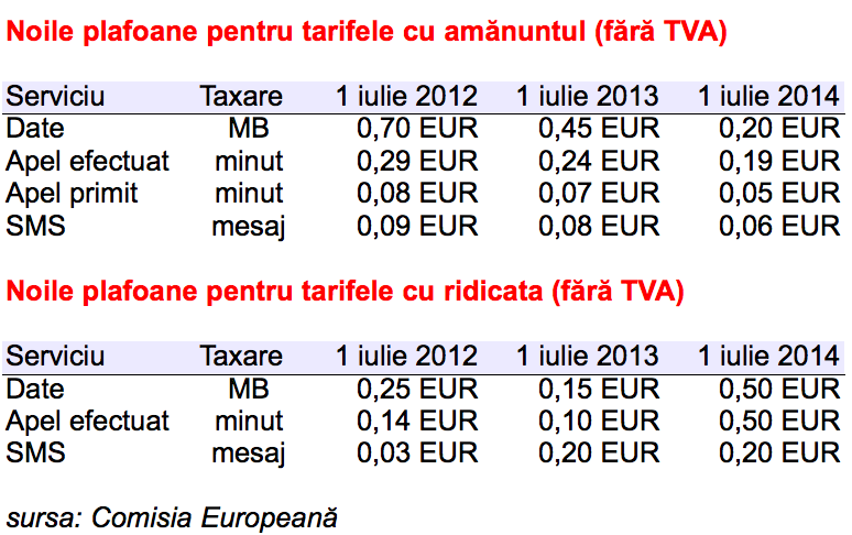 Noile plafoane tarifare, care intra in vigoare la 1 iulie 2013, sunt: