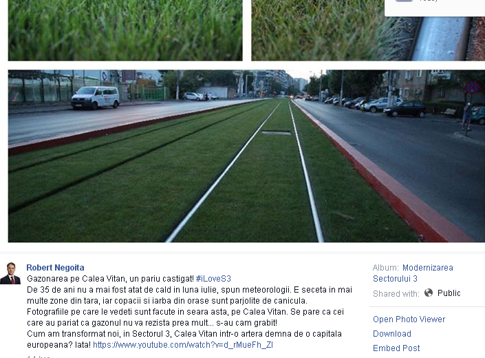 „Gazonarea (sic! – n.red.) pe Calea Vitan, un pariu câştigat! #iLoveS3. De 35 de ani nu a mai fost atat de cald în luna iulie, spun meteorologii. E secetă în mai multe zone din ţară, iar copacii şi iarba din oraşe sunt pârjolite de caniculă. Fotografiile pe care le vedeţi sunt făcute în seara asta, pe Calea Vitan. Se pare că cei care au pariat că gazonul nu va rezista prea mult… s-au cam grăbit!”, scrie Robert Negoiţă pe Facebook, unde postează, alături de fotografii, şi un filmuleţ în care se poate vedea cum au plantat gazonul angajaţii primăriei pe care o conduce.