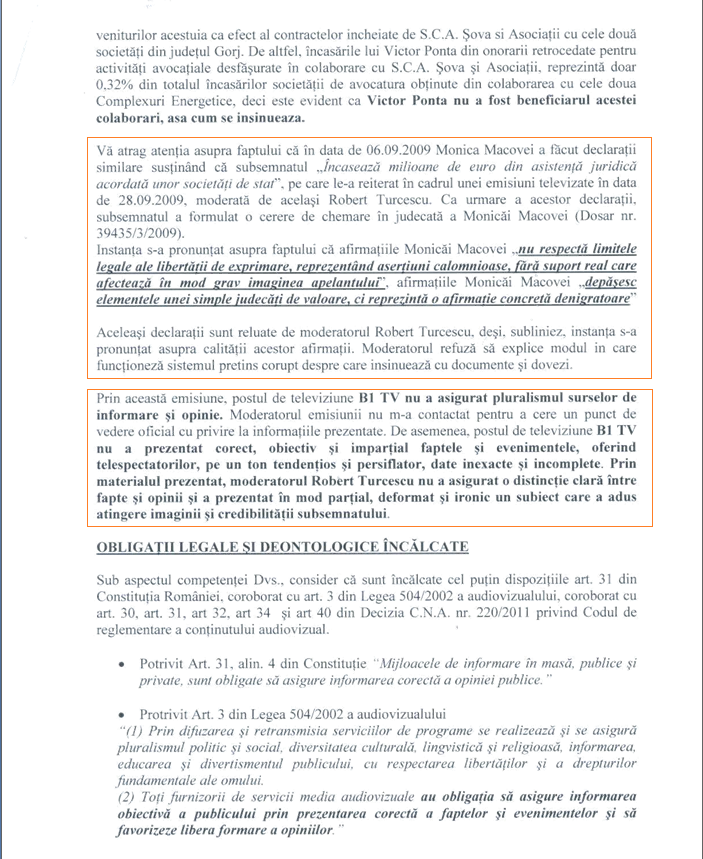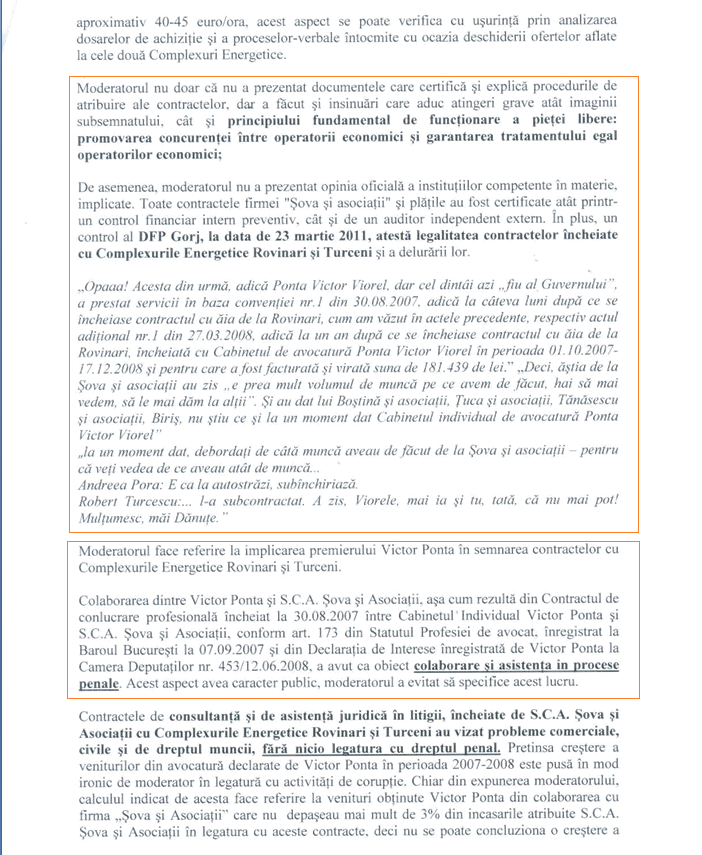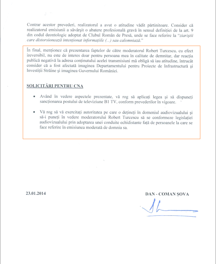 Pe 23 ianuarie 2014, Dan Sova inainta catre CNA o reclamatie prin care cerea membrilor Consiliului sa ma sanctioneze pentru o emisiune in care discutam subiectul contractelor dintre casa de avocatura a domnului Sova si complexurile energetice Turceni si Rovinari. In discutia pe care am purtat-o in studio, cu documente prezentate, unele dintre ele, in premiera in spatiul public, am vorbit si despre legaturile de acum niste ani dintre firma lui Dan Sova si avocatul Victor Ponta (ajuns intre timp prim-ministru). Nu mai stiu daca am luat sau n-am luat amenda de la CNA. Si nici nu mai are mare importanta. Important e sa cititi in original, mai jos, plingerea semnata in ianuarie anul trecut de domnul Sova. Eu cred ca fiind un document sub semnatura, inregistrat la o institutie a statului roman (Consiliul National al Audiovizualului) poate fi interesant inclusiv pentrtu procurori. Mai ales ca, din cite se aude, in speta Sova s-au distrus niste hard-diskuri…