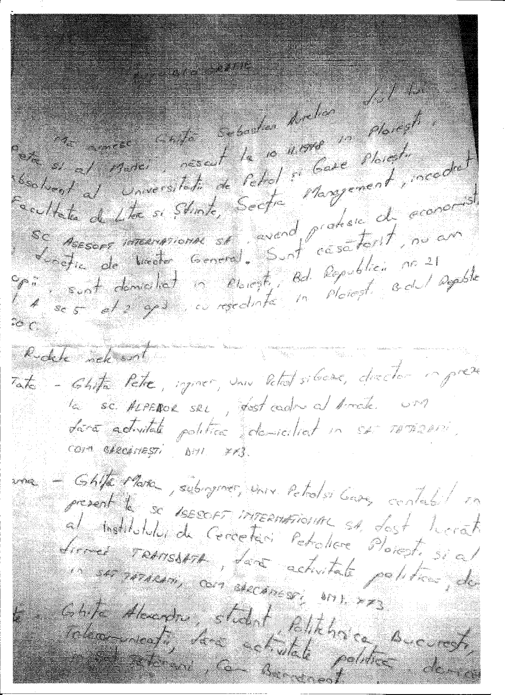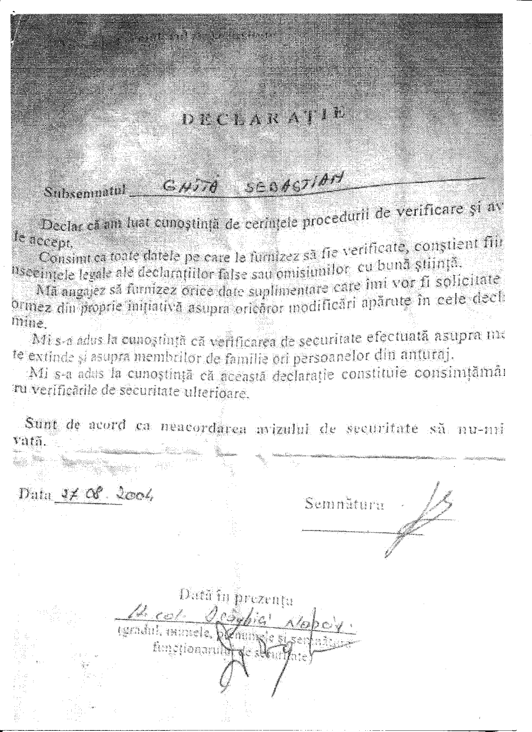 Nimeni, nici macar Sebastian Ghita, n-a dat pina acum un raspuns clar privind documentele de mai jos: o declaratie si o autobiografie semnate, atentie, pe 27.08.2004! La vremea aceea Sebastian Ghita era mic copil, dar, probabil, il „adoptase” sistemul.