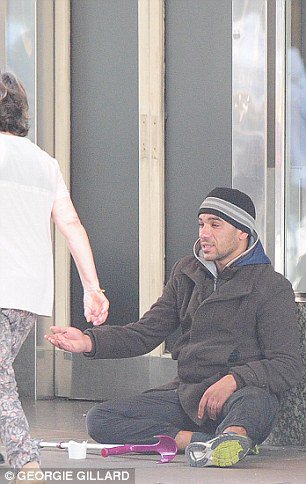 Cu mâna întinsă, Petru se roagă de oamenii care trec pe stradă și ocazional flutură un baston roz, ca sa arate că are probleme locomotorii.