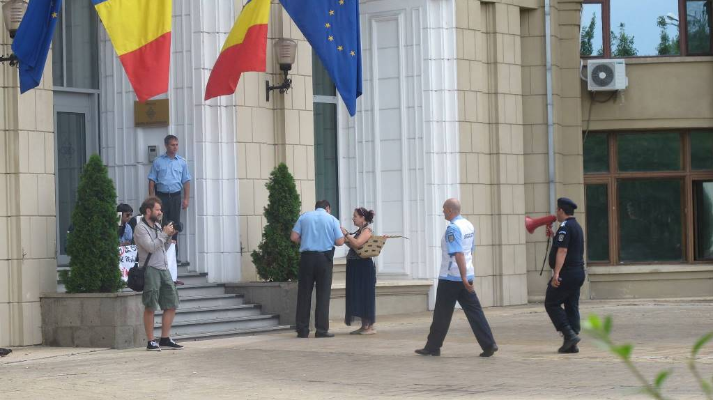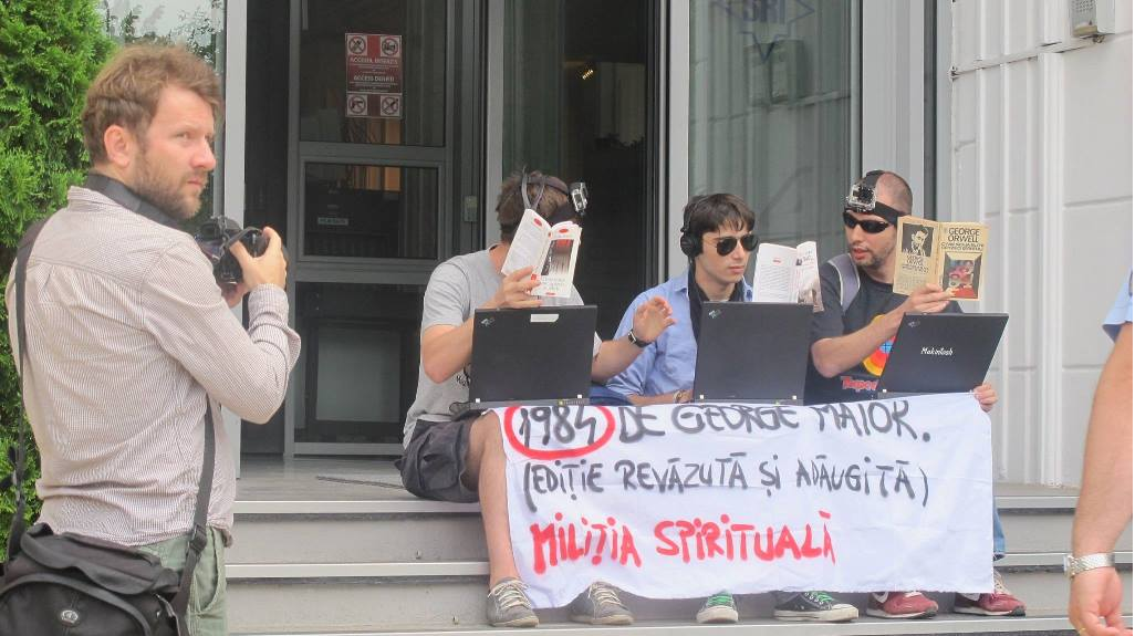 Trei activiști Miliția Spirituală au fost sancționați astăzi (joi, 10 iulie) de către jandarmi cu amenzi de câte 500 de lei pe motiv că ar fi organizat o “adunare publică neautorizată” și că ar fi “blocat accesul în sediul Serviciului Român de Informații” (SRI). Cei trei au citit timp de o oră George Orwell (“1984″) pe treptele din fața SRI și aveau bannere inscripționate cu mesajele: “1984 de George Maior. (Ediție revăzută și adăugită)”, “Dumbravă, minunata lume nouă”, “Surveillance Law? What the Foucault!”, care făceau referire la autorii George Orwell și Michel Foucault, la abuzurile statelor totalitare, la directorul SRI George Maior și la generalul SRI Dumitru Dumbravă.