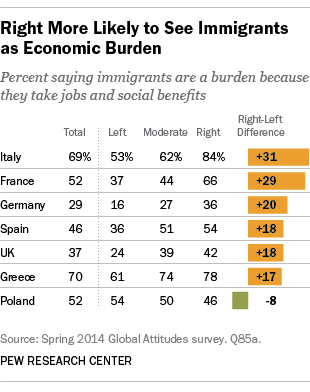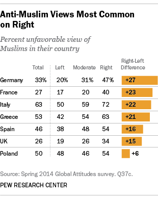 Un al doilea articol e analiza unui sondaj realizat de Pew Research Center. Analiza în sine urmărește modul în care percepția cetățenilor UE privind migrația și, printre altele, în mod specific, migrația musulmanilor e influențată de ideologiile pe care și le asumă respectivii cetățeni și observă un dezechilbru destul de evident între adepții valorilor de stânga și cei ai valorilor de dreapta (datele sunt extrase dintr-un sondaj premergător alegerilor europene din luna mai a anului trecut, încercând să explice anumite tendințe de vot). Concluzia e că cei care împărtășesc valori de dreapta se pronunță mult mai pregnant împotriva imigranților și/sau a musulmanilor, de unde și regăsirea acestei teme preponderent pe agenda unor formațiuni radicale de dreapta ca UKIP (Marea Britanie), Frontul Național (Franța) ori Zori Aurii (Grecia).