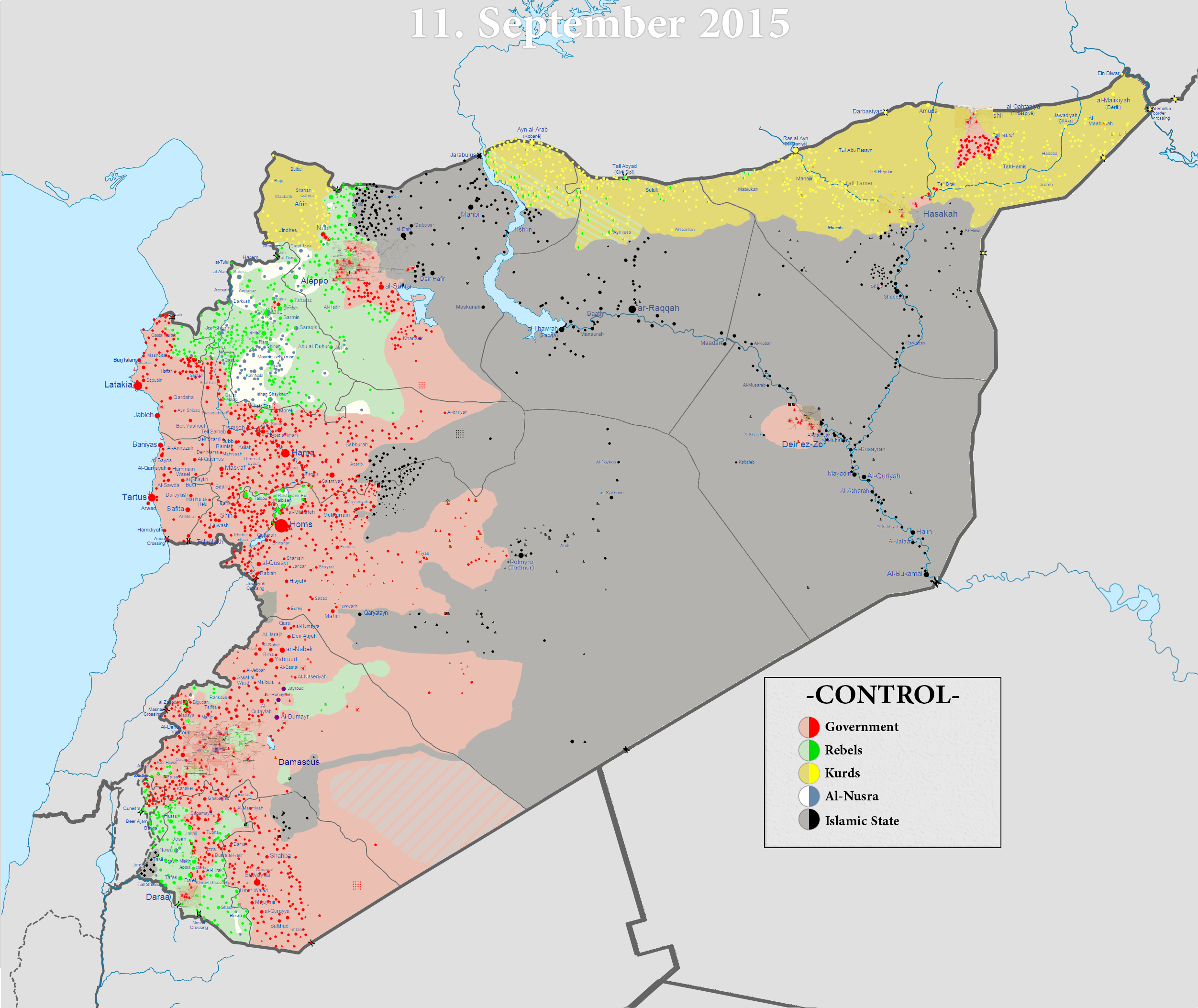 Situația conflictelor din Siria, la 11 septembrie 2015. Cu galben sunt forțe kurde, cu verde – rebelii, cu roz- forțele guvernamentale, cu gri – ISIS, cu alb – milițiile Al-Nusra. Acuma, fiecare se luptă cu fiecare în parte. Puțină raționalitate, vă rog: chiar credeți că vreuna din grupările astea își permite să trimită mii (zeci de mii) de ”invadatori” în Europa, să deschidă un nou front (!?), înainte de a câștiga războiul intern?