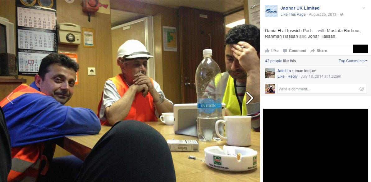 În august 2013, de altfel, Johar Hasan (ultimul din dreapta fotografiei) se afla personal la bordul Rania H, în portul englezesc Ipswich (așa cum arată o fotografie postată pe Facebook de către Jaohar Uk Limited, companie deținută de Khaled Jaohar, văr al lui Johar Hasan).