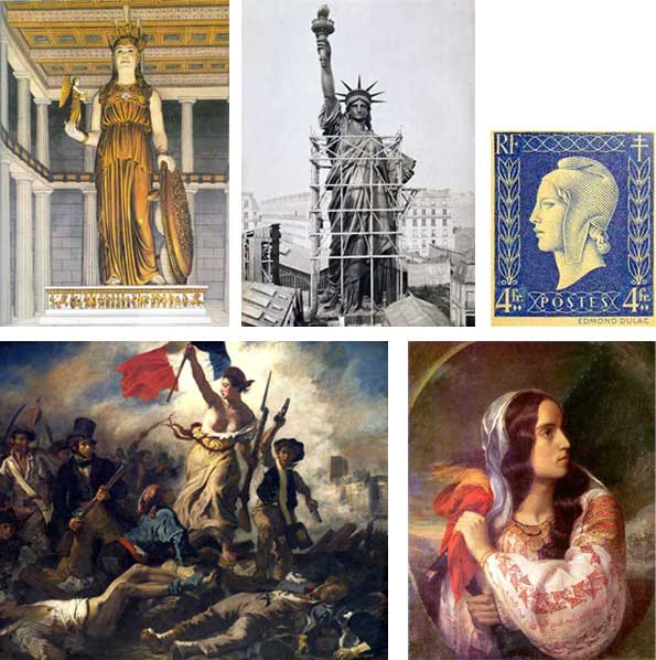 1. Athena Parthenos, reconstituire; 2. Frédéric Auguste Bartholdi, Statuia Libertății; 3. Edmund Dulac, Marianne, Franța Liberă, timbru 1942; 4. Delacroix, Libertatea conducând poporul; 5. Rosenthal, România revoluționară