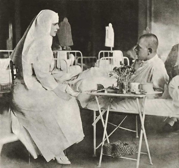 La noi, exact așa s-a petrecut în realitate, odată cu intrarea României în Primul Război Mondial, când Regina Maria, „mama răniților”, a fost supusă unui proces de madonizare declanșat de acei feciori care-și lăsaseră mamele și soțiile acasă, înlăcrimate și mândre deopotrivă. Măreția Reginei a fost aceea de a fi „coborât” printre soldați, dând un conținut palpabil erosului sublimat al patriotismului și întrupând dintr-odată, într-o persoană, fantasma înalt erotică a alegoriilor patriotice tradiționale. În locul unui tablou alegoric atârnat pe pereții spitalului, în locul portretului unui rege abulic (care a cam exasperat-o pe regină de-a lungul războiului), soldații aflați pe paturile de spital s-au pomenit în preajma lor cu o ființă de lumină de o frumusețe ireală. Stând lângă paturile răniților, luând în mâna ei mâna muribunzilor, privindu-i în ochi („Zilele acestea m-am aplecat peste atâtea paturi și am privit în atâția ochi, și toți mă urmăresc la fiecare mișcare, de cum mă întorc îi simt asupra mea, sute și sute…” – 12 septembrie 1916), această femeie, cu ținuta ei covârșitoare, îmbrăcată în uniformă de infirmieră, transforma chipul morții și al suferinței în imaginea unui înger alb care iradia bunătate și iubire. (Un soldat, „în stare să stea în capul oaselor în pat, s-a uitat bine la mine, apoi a spus foarte simplu: «Acum, că v-am văzut, nu mă mai doare nimic».” – Jurnal, p. 142)