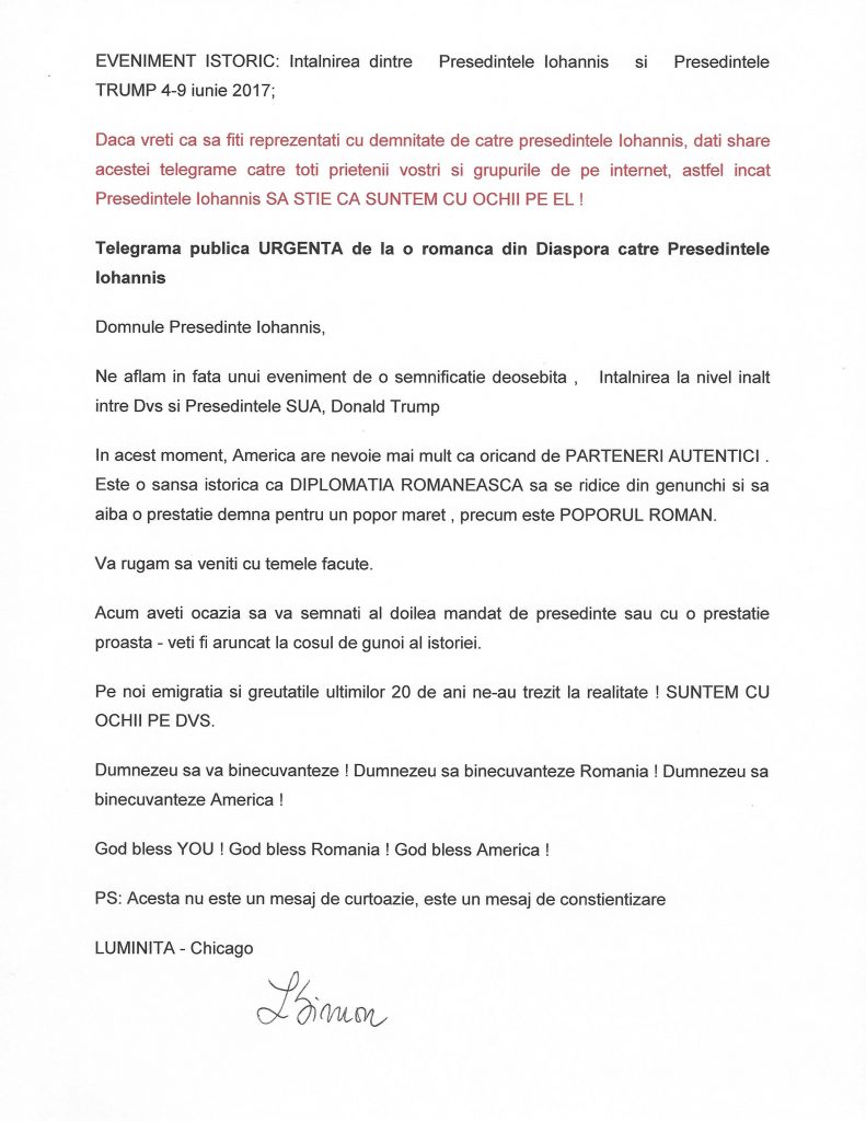 Telegrama publica URGENTA de la o romanca din Diaspora catre Presedintele Iohannis: