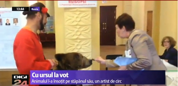 Nu a fost, însă, o vizită de curtoazie, fiindcă animalul l-a însoţit pe stăpânul său, un artist de circ. Bărbatul a vrut cu tot dinadinsul să voteze şi s-a gândit să le facă o surpriză membrilor comisiei. Fără pic de teamă, aceştia s-au apropiat de urs şi i-au înmânat chiar ştampila de vot.