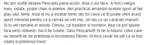 Ruxandra Dragomir a postat un mesaj pe Facebook prin care îl atacă pe Dinu Pescariu şi îl anunţă că trebuie să dea uitării prietenia care i-a legat: “Nu am vorbit despre Pescariu până acum, însă o voi face. A fost colegul meu, odată, poate chiar şi prieten. Am practicat amândoi acelaşi sport al fair-play-ului, tenisul. Însă el nu a invăţat nimic din tot ceea ce iţi poate oferi acest sport minunat, pentru că a rămas un om mic, un laş, cu un caracter mărunt. Şi tu vei rămâne în istorie, Dinuţu, ca trădător şi turnător. Aşa că pot spune făra nicio reţinere: Să-ţi fie ruşine, Dinu Pescariu! Şi ţie si tuturor celor care au beneficiat de prietenia şi încrederea Elenei. Şi încă ceva! Să uiţi că ai fost odată şi prietenul meu”!