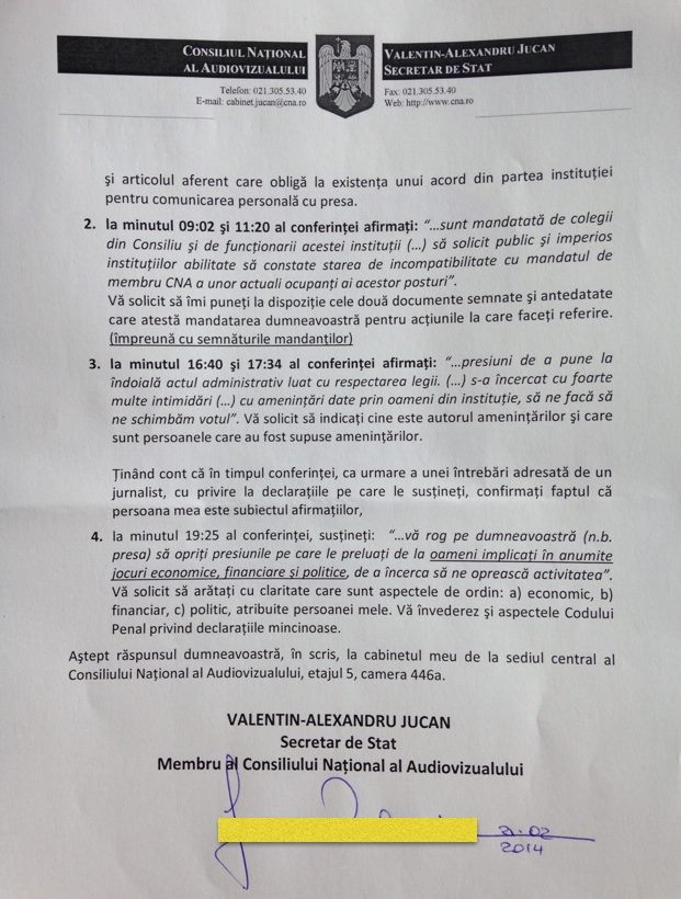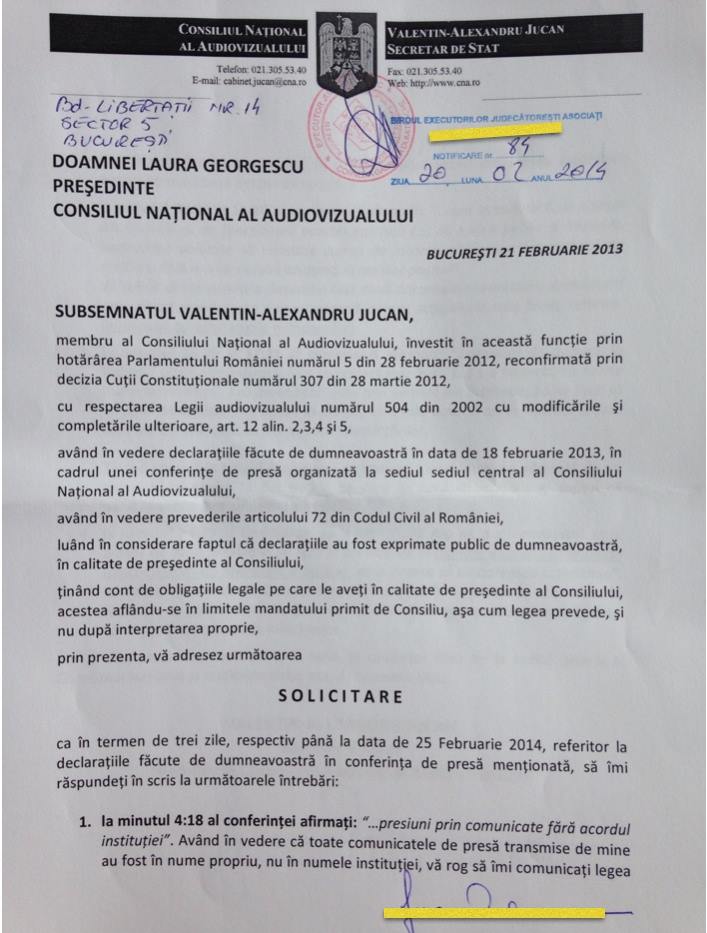 Colegul meu, Valentin Jucan, a trimis azi un executor judecătoresc la președintele CNA, care i-a dat termen până marți să pună la dispoziție dovezile scrise cu privire la câteva acuzații grave lansate la adresa lui. În urmă cu trei zile, Laura Georgescu a suspendat ședința CNA fără niciun motiv plauzibil, după ce a tergiversat cât a putut de mult rediscutarea amenzilor discreționare aplicate Antena 3 și B1 TV. A organizat o conferință de presă în numele CNA și a susținut public că este mandatată de angajații instituției, precum și de ”colegii din CNA” să sesizeze comisiile parlamentare, Registrul Comerțului, ANI și CSM (!!!) în legătură cu incompatibilități ale unor actuali membri ai Consiliului. Președintele CNA nu a dat niciun nume și niciun indiciu concret, lăsând, totuși, să planeze suspiciuni asupra altor membri care sunt deja declarați incompatibili de către ANI: Christian Mititelu și Răsvan Popescu. Ea a afirmat, în numele instituției, că a trimis deja documentele. Din informațiile pe care le dețin, aceste documente nu au fost primite de instituțiile enumerate. Dacă eu nu dețin informații corecte, voi fi infirmată de dovezile pe care Laura Georgescu va trebui sa i le prezinte în scris lui Valentin Jucan. Aluziile Laurei Georgescu îl vizau în special pe el, dar și pe mine, precum și pe cel de-al treilea coleg Florin Gabrea, cei trei care ne opunem deciziilor arbitrare adoptate de CNA. De aceea, eu sunt solidară cu acțiunea lui Valentin Jucan și o susțin. Iata și documentul trimis prin executor judecătoresc: