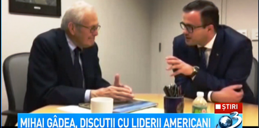 Mihai Gâdea, discuţii cu liderii americani- a titrat joi postul de televiziune Antena 3. Știre în regim de breaking news. În imagini, cunoscutul realizator al postului din Băneasa era prezentat întreținându-se relaxat cu fostul ministru american al apărării, Donald Rumsfeld.
