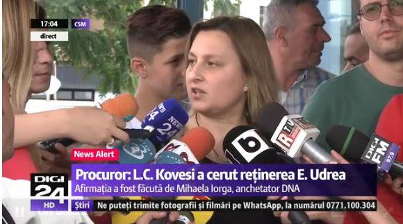 Procurorul Mihaela Moraru Iorga a vorbit marți, după ședința de la CSM, în care s-a discutat cererea de revocare făcută de șefa DNA, despre presiunile făcute asupra sa în anumite dosare. Aceasta a spus că i s-a transmis din partea Codruței Kovesi că Elena Udrea ar trebui reținută pentru 24 de ore, deși Parlamentul nu încuviințase și cererea de arestrare a acesteia, scrie b1.ro