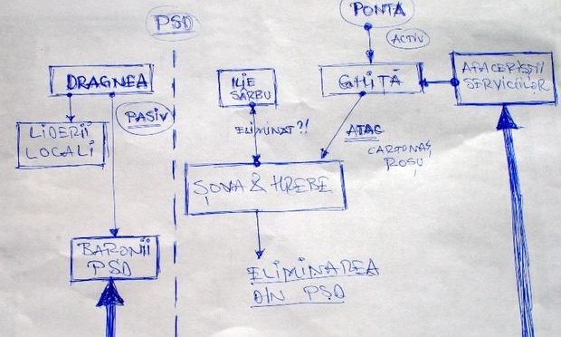 Decriptarea schemei (vezi facsimil) prezentată la Realitatea TV, în direct, luni seară, la emisiunea lui Rareş Bogdan, „Jocuri de putere”, imediat după ce Sebi Ghiţă a solicitat suspendarea din PSD a binomului Viorel Hrebenciuc-Dan Şova trebuie „citită” de sus în jos.