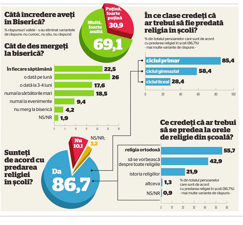 De altfel, istoria religiilor este materie opțională la liceu de la sfârșitul anilor ’90 încoace. Există manuale alternative de istorie a religiilor- unul bun, scos de Polirom. Dar, se pare, nu prea există cerere pentru așa ceva, poporul ăsta e bun doar să voteze, dar nu vrea să se „deștepte”, să se „elibereze”, să accepte că, spre deosebire de sex, care a devenit public, credința a devenit o chestie strict privată, cum zicea Bronislaw Wilstein.