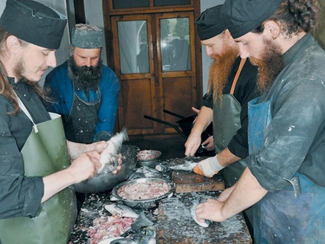În mod tradițional, călugării de la Muntele Athos nu consumă deloc carne, mănânca foarte puține lactate, pește doar în zilele de ospăț și beau puțin vin roșu produs local, în podgoriile de pe dealurile grecești.