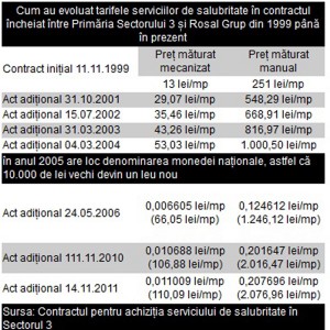 “In anul 1999, valoarea contractului de curatenie a cailor publice a fost stabilita la suma de 189.792.720.390 lei vechi (circa 19 milioane lei noi) pentru o perioada de cinci ani, adica mai putin de 4 milioane lei noi pe an. In noiembrie 2011, Negoita ii plateste lui Prigoana maxim 126.848 lei pe luna pentru maturat mecanizat, la care se adauga cel mult 5.389.253 lei pe luna pentru maturat manual, plus inca 382.893 de lei pe an pentru spalarea carosabilului si inca 8.467 lei pe saptamana pentru stropitul strazilor. In total, 67.016.389 lei pe an, adica de 3,5 ori mai mult ca in perioada de debut a contractului. In cazul operatiunilor de deszapezire, pentru sezonul rece din perioada 15 nov 1999 – 15 martie 2000, Rosal s-a inteles cu Primaria Sectorului 3 sa ia 17.200.000.000 lei vechi, adica 1.720.000 lei noi. In iarna 2011-2012, contractul prevede plata sumei de circa 16 milioane de lei din care Primaria Sectorului 3 sustine ca va plati doar zilele lucrate efectiv de Rosal, adica suma de 4.818.825 lei” scriu jurnalistii de la B365.ro.