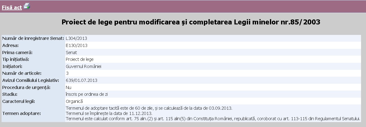 Conform ordinei de zi publicata pe site-ul Senatului proiectul de lege este o prioritate legislativa a Guvernului Romaniei si in cazul in care nu va fi dezbatuta in plen va trece prin adoptare tacita in data de 16 decembrie 2013.