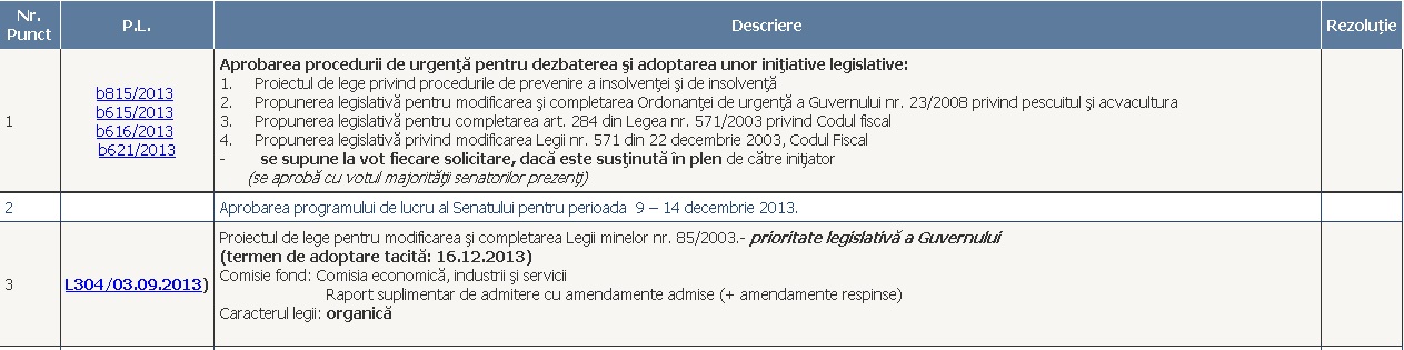 Totusi, conform fisei proiectului de lege in dezbatere actul normativ nu este supus procedurii de urgenta, iar termenul de adoptare tacita este 11 decembrie 2013 si nu coincide cu cel de pe ordinea de zi a Senatului.