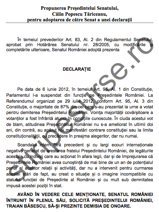 “Senatul va cere in plen demisia de onoare a Presedintelui. Va trebui o declaratie nu doar a Senatului ci sa initieze si Camera Deputatilor un demers similar, si Parlamentul sa formuleze o declaratie comuna. (…) Declaratia privind demisia are valoare politica. Declaratia nu poate fi ignorata nici pe presedinte, nici de opinia publica, nici de partenerii internationali.