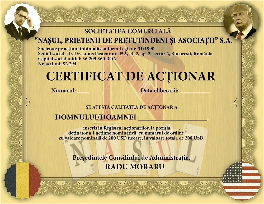 Invingatorilor, haideti sa facem o echipa puternica ! Asteptam mesajele d-voastra pe [email protected] sau la telefonul mobil +40.723.342.104. Va asteptam sa cumparati o Actiune din editia limitata Trump-Nasul ! Sau mai multe, daca doriti sa faceti un cadou adevarat celor apropiati !