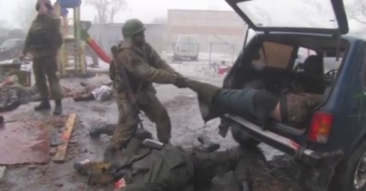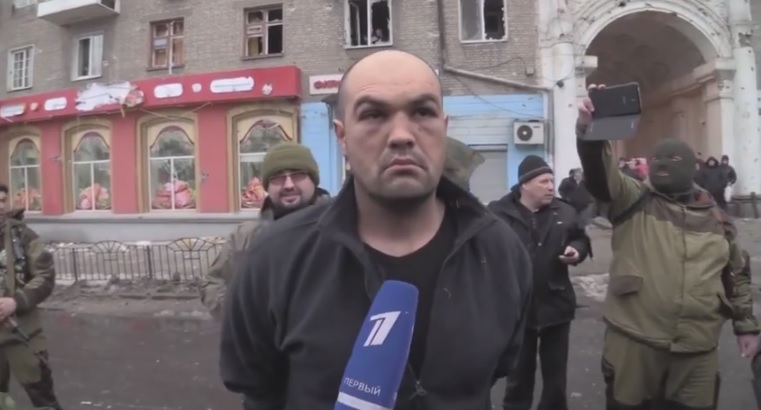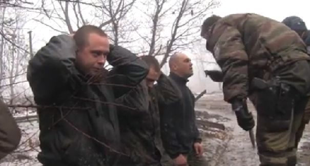 Unul dintre militarii ucraineni a fost dus în stația unde cel puțin 13 civili au fost uciși în urma căderii unui obuz peste un troleibuz, atac pentru care trupele ucrainene și rebelii se acuză reciproc. După cum se poate vedea într-o înregistrare postată pe YouTube, soldatul cu fața plină de vânătăi primește numeroase lovituri în timp ce reporterii ruși apropie microfoanele de el, iar alături, căzută pe asfalt, încă se afla una dintre victimele atacului.
