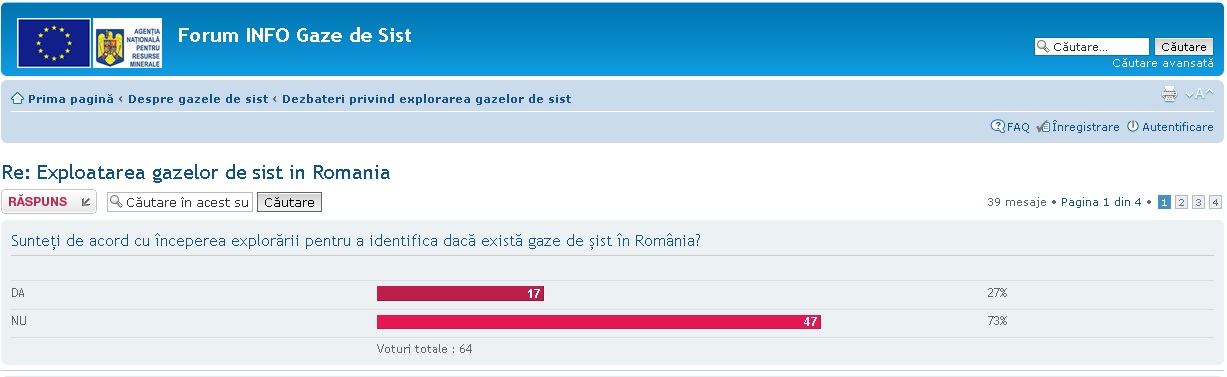 Intr-un sondaj disponibil pe pagina creata de ANRM pentru informarea privind gazele de sist se arata ca 73% dintre cei care au raspuns nu sunt de acord cu exploatarea gazelor de sist pe teritoriul Romaniei.