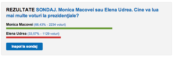 Monica Macovei ar putea obține de două ori mai multe voturi decât Elena Udrea. Asta arată un sondaj online realizat de ziarul Gândul, care le-a cerut cititorilor online să opteze între cele două candidate. La 10 ore de la publicarea sondajului, Monica Macovei avea 66,43% din voturi, în vreme ce Elena Udrea obținuse doar 33,57%.