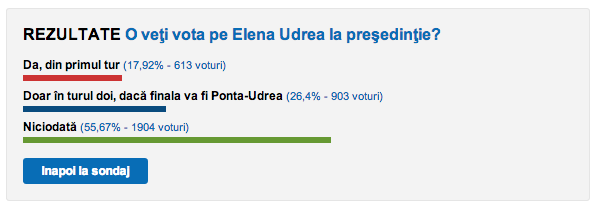 Un alt sondaj online, realizat tot de ziarul Gândul, demonstrează capitalul negativ de imagine pe care îl are Elena Udrea. Din totalul participanților, 55,67% nu ar vota-o niciodată, 26,4% ar pune ștampila pe ea doar în turul 2 dacă îl va avea ca adversar pe Victor Ponta și doar 17,92% ar vota-o din primul tur.