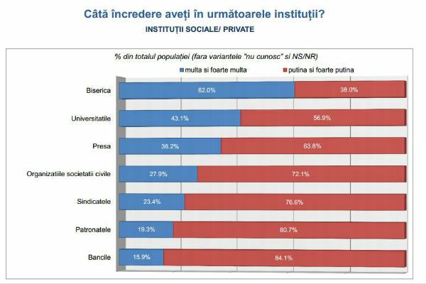 Topul încrederii în instituțiile sociale sau private în iulie este condus de Biserică — 62% încredere multă și foarte multă, față de 63,1% în mai. Biserica este urmată de Universități, cu 43,1%, față de 44,4% în mai, presă 36,2% (față de 33,9% în mai), organizațiile societății civile 27,9% (față de 29,8%), sindicate 23,4% (față de 22,2% în mai), patronate 19,3% (față de 17,7% în mai 2014) și bănci, 15,9% (față de 14,6% în mai).