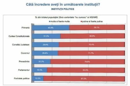 Potrivit sondajului, cifrele încrederii în instituțiile politice pentru iulie sunt următoarele: Primăriile — 40,9% (39,6% în mai 2014), Curtea Constituțională — 31,2% (29,8% în mai), Consiliile județene — 29,6% (28,8% mai), Guvernul — 28,6% (29,2% în mai), Președinția — 20,2% (21,8% în mai), Parlamentul — 16,5% (17,6% în mai), partidele politice — 12,5% (10,5% în mai).