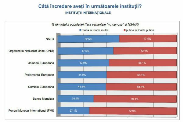 Cercetarea arată că ierarhia instituțiilor internaționale este următoarea: NATO — 52,5% (50,1% în mai 2014), ONU — 47,6% (44,4% în mai), UE — 43,9% (44,8% în mai), Parlamentul European — 41,9% (față de 40,2%), Comisia Europeană — 41,3% (39,7% în mai), Banca Mondială — 30,9% (29,2% în mai), FMI — 27,1% (23,9% în mai).