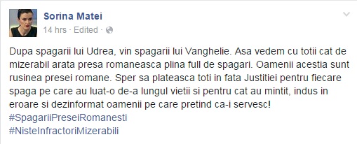 „După șpăgarii lui Udrea, vin șpăgarii lui Vanghelie. Așa vedem cu toții cât de mizerabil arată presa românească plină full de șpăgari. Oamenii aceștia sunt rușinea presei române. Sper să plătească toți în fața justiției pentru fiecare șpagă pe care au luat-o de-a lungul vieții și pentru cât au mințit, indus în eroare și dezinformat oamenii pe care pretind că-i servesc”, scrie Sorina Matei pe pagina de socializare.