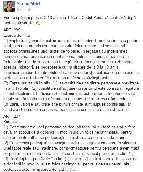 De asemenea, Sorina Matei îi informează oe „jurnaliștii spăgari” și care sunt pedepsele cu închisoarea: 3-10 ani sau 1-5 ani.