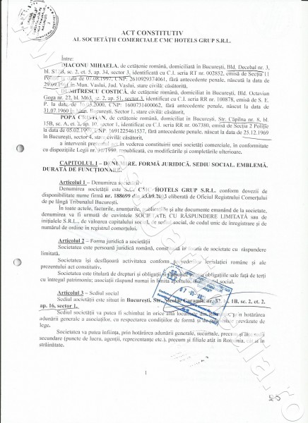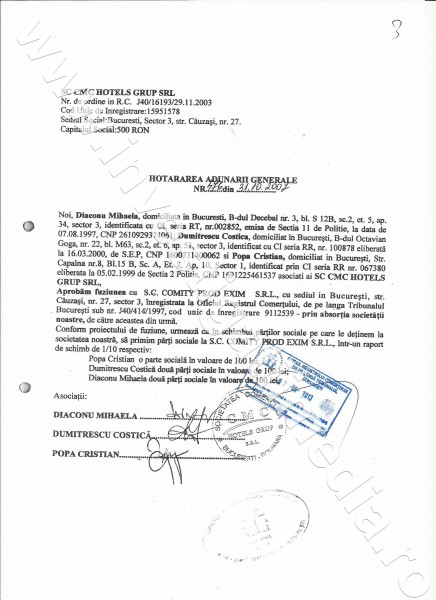 Doi ani mai tarziu, in 6 noiembrie 2003, la Registrul Comertului se inregistreaza firma CMC Hotels, care, conform actului constitutiv obtinut de Centrul de Investigatii Media, ii are ca actionari pe aceiasi Costica Dumitrescu (40 la suta) si Cristian Popa (20 la suta), alaturi de care apare sotia lui Gelu Stefan Diaconu, Mihaela Diaconu, ce detine restul de 40 la suta din firma. Este momentul la care intre familia Diaconu si actionarii firmei specializate in comertul duty-free apare o legatura de afaceri permanenta.