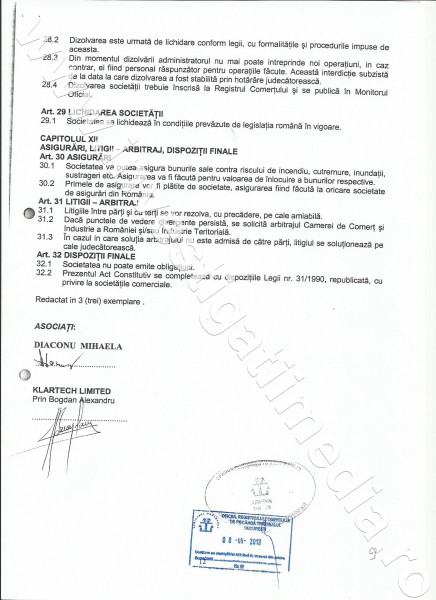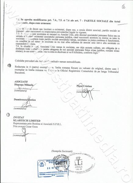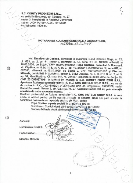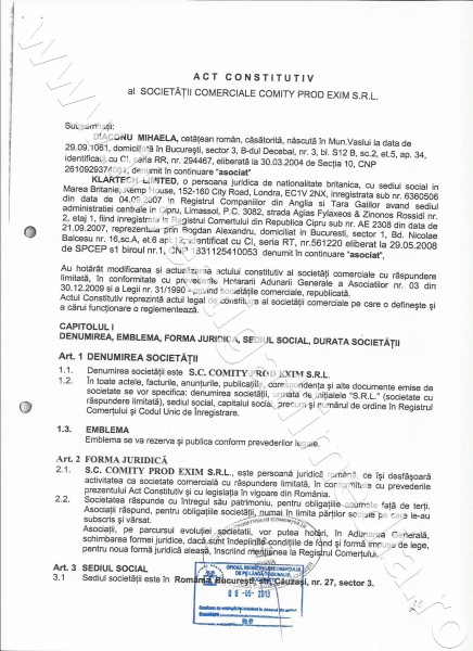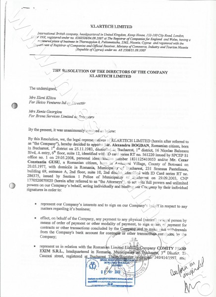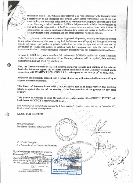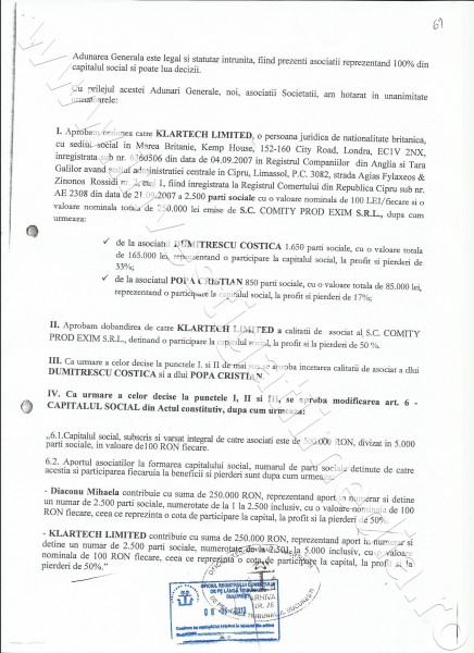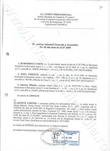 Pe 22 iulie 2009, actionariatul Comity Prod Exim SRL se schimba din nou. Mihaela Diaconu ajunge sa aiba jumatate din firma, iar Dumitrescu si Popa isi vand jumatatea lor catre un off-shore, Klartech Limited, o societate inregistrata in Marea Britanie ca firma overseas cipriota.