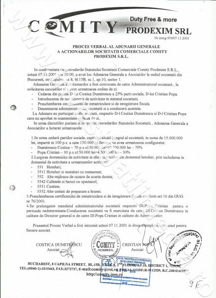 Firma Comity Prod Exim a fost infiintata in 1997 de doua persoane: Costica Dumitrescu si Cristian Popa. Specialitatea celor doi oameni de afaceri a fost comertul prin controversatele magazine duty-free, asa cum reiese chiar din antetul pe care firma il foloseste, dar si din alte documente obtinute de Centrul de Investigatii Media.